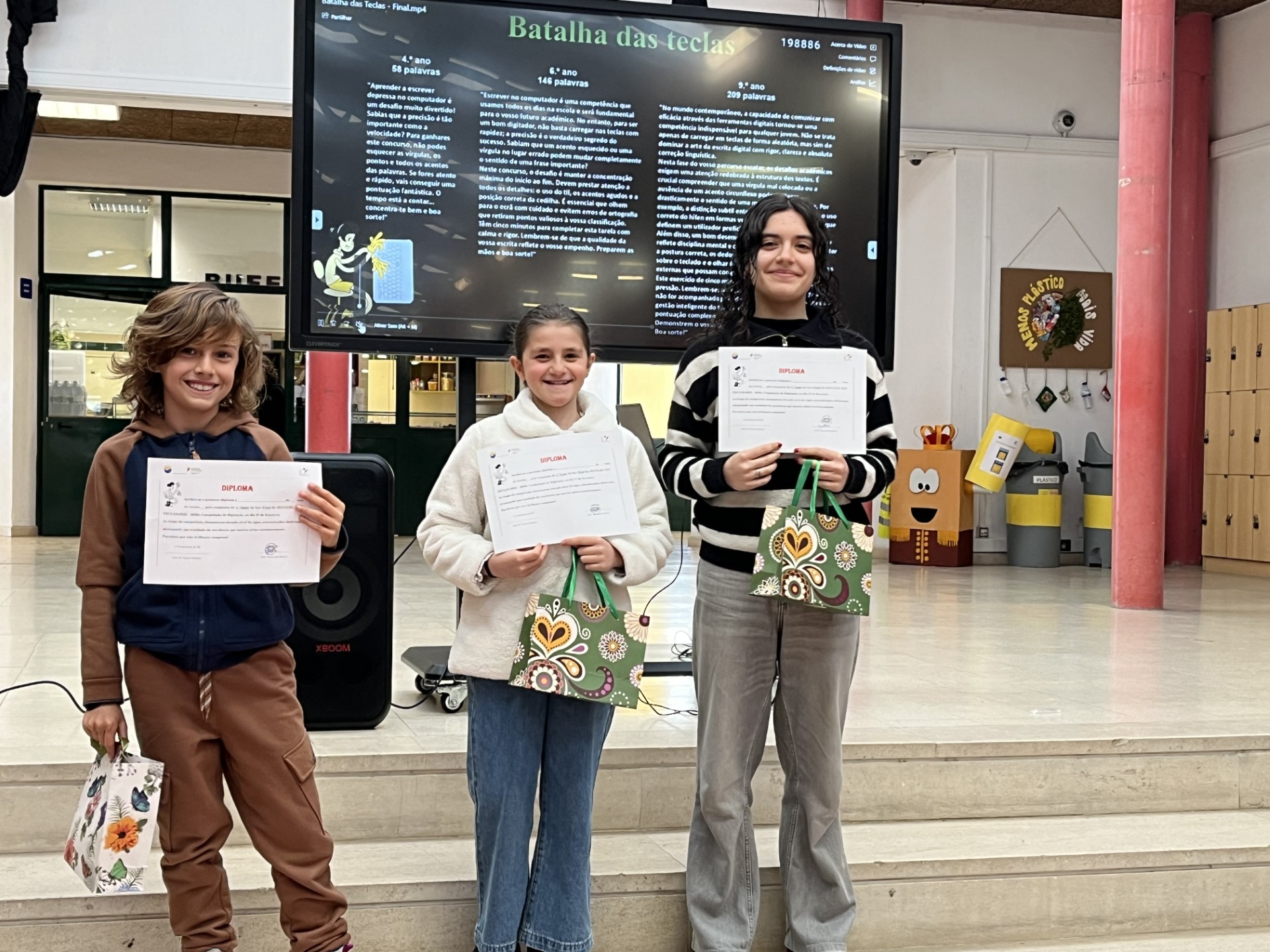 Com velocidade, persistência, habilidade e precisão, apoiados pela comunidade escolar, que assistiu com entusiasmo, os alunos realizaram uma prova de digitação durante 5 minutos. Cada ano efetuou uma prova adequada ao seu nível.