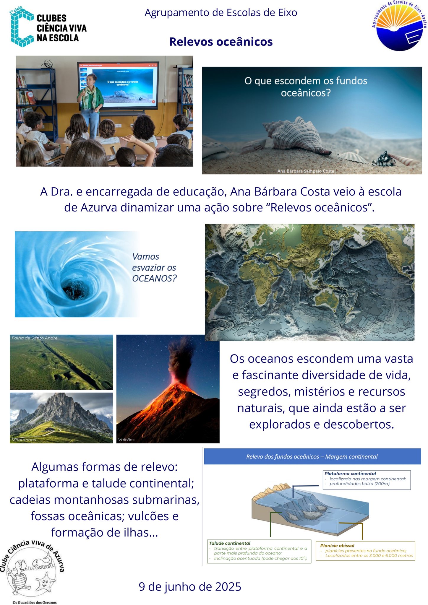O Clube Ciência Viva de Azurva, no âmbito da comemoração do dia dos Oceanos, participou uma ação dinamizada pela encarregada de educação, Dra. Ana Bárbara Costa, sobre "Relevos oceânicos", também conhecido por relevo submarino.