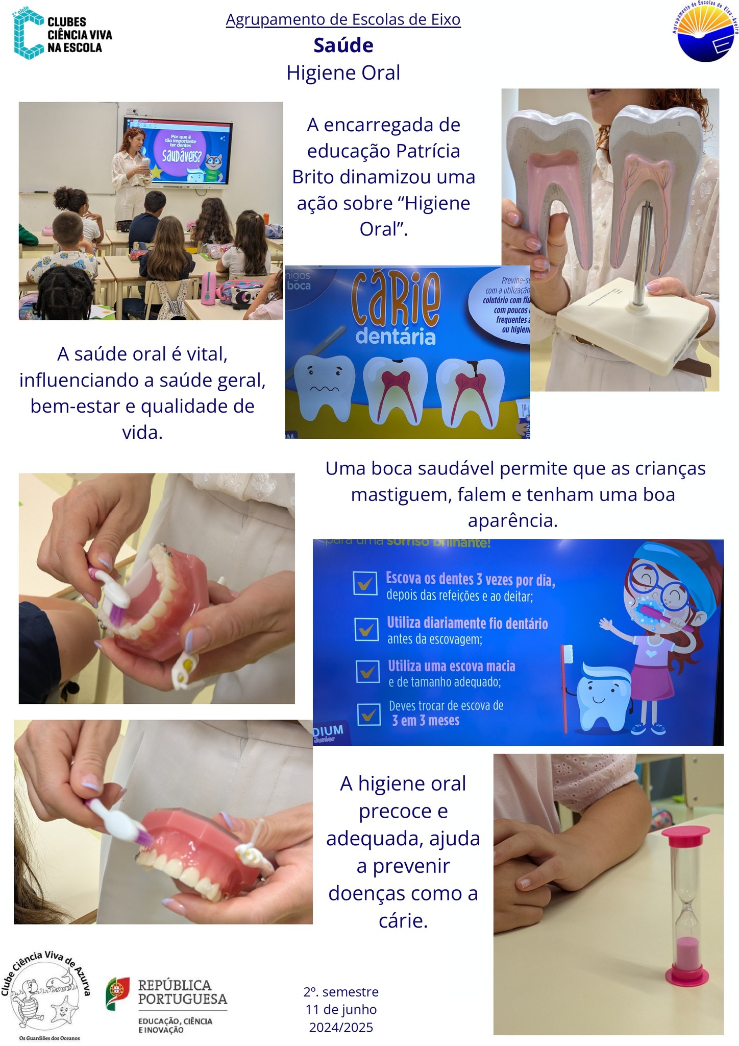 O Clube Ciência Viva da EB de Azurva convidou a encarregada de educação Patrícia Brito para dinamizar uma ação sobre Saúde Oral e o resultado foi fabuloso: os alunos revelaram-se interessados e atentos e aprenderam a importância de prevenir doenças e de cuidar dos dentinhos!