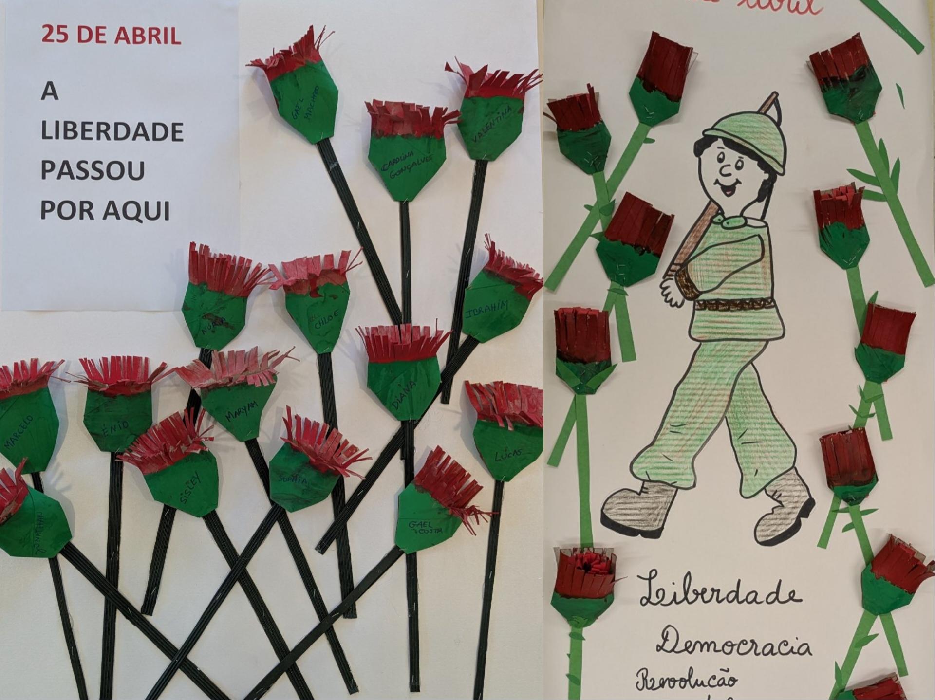 Os alunos do AEEixo comemoraram o 25 de abril, com a leitura e exploração de textos, histórias e documentários, audição de músicas, construção de cravos e exposição de cartazes no Agrupamento.