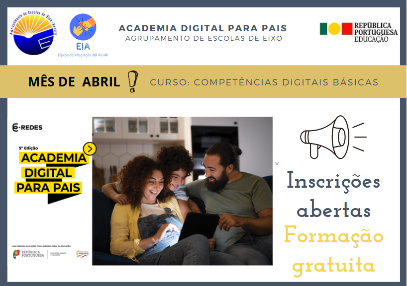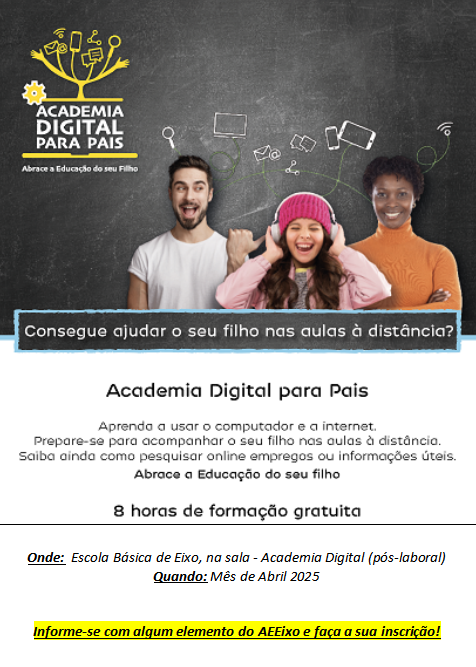 Como já é de conhecimento, a Academia Digital para Pais está disponível no AEEixo e este ano letivo volta a promover, no decorrer do mês de abril, o Curso de Competências Digitais Básicas! Com o objetivo de capacitar Pais e Encarregados de Educação, ao nível das competências digitais básicas, estas ações de formação são gratuitas e serão realizadas em horário pós-laboral, na Escola Básica de Eixo, na sala - Academia Digital - equipada com computadores doados pela E-REDES.