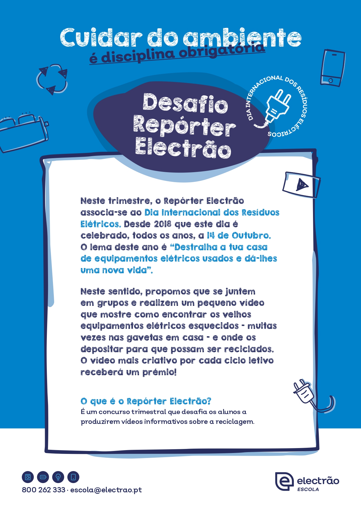 Neste âmbito, e na senda da importância da reciclagem de aparelhos elétricos, os alunos foram desafiados a produzir um breve vídeo alusivo “à caça de equipamentos elétricos esquecidos” apelando a que sejam depositados nos locais devidos para o efeito e divulgando alguns desses locais, onde possam ser recuperados para uma nova vida!