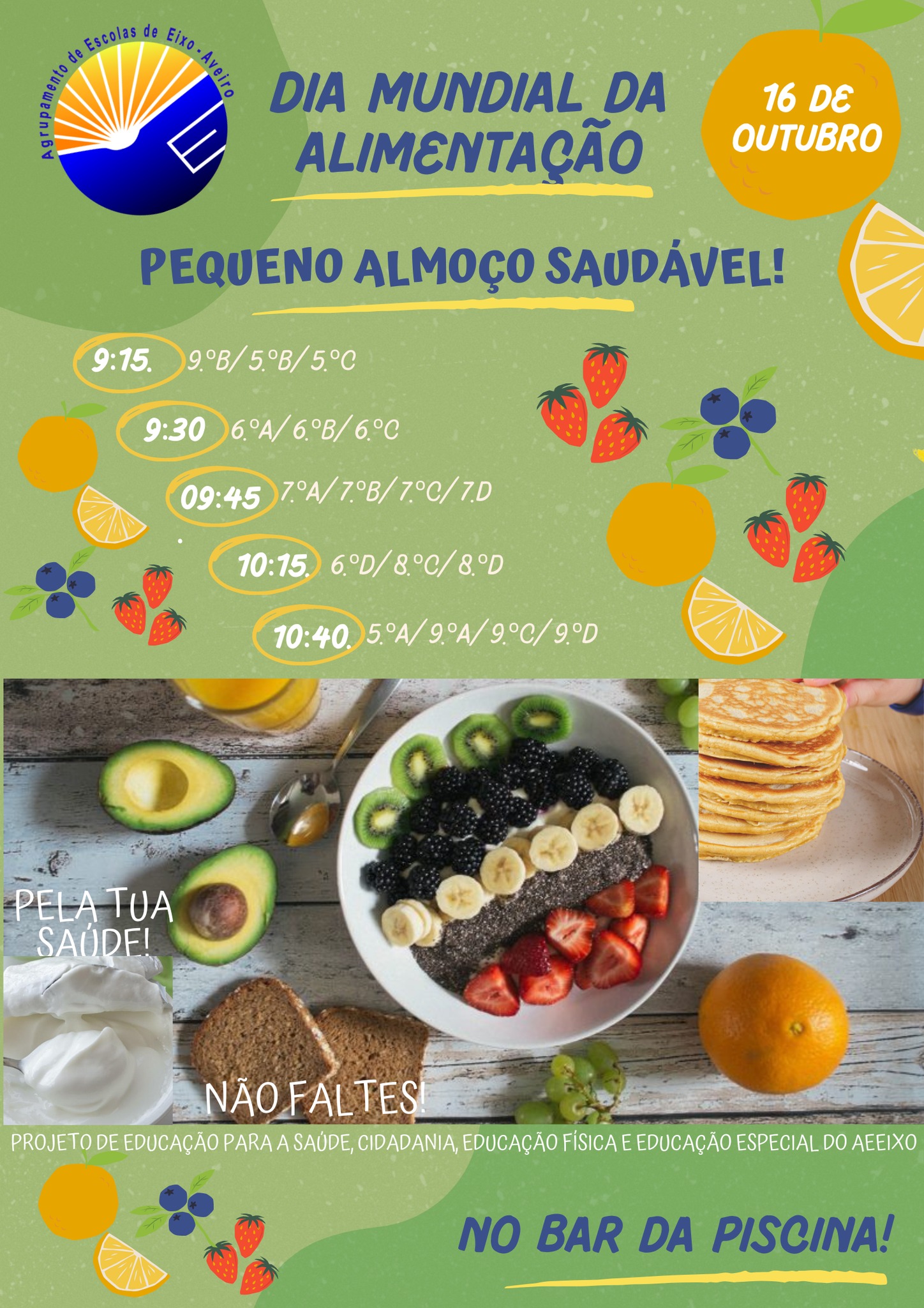 O Projeto de Educação para a Saúde, em parceria com as áreas de Cidadania, de Educação Física e com o Departamento de Educação Especial confecionou e serviu um delicioso pequeno-almoço saudável a todos os alunos do 2.º e do 3.º ciclo no qual a fruta foi a rainha da festa, à mistura com sementes, mel, compotas, iogurtes naturais e papas de aveia! Uma delícia!