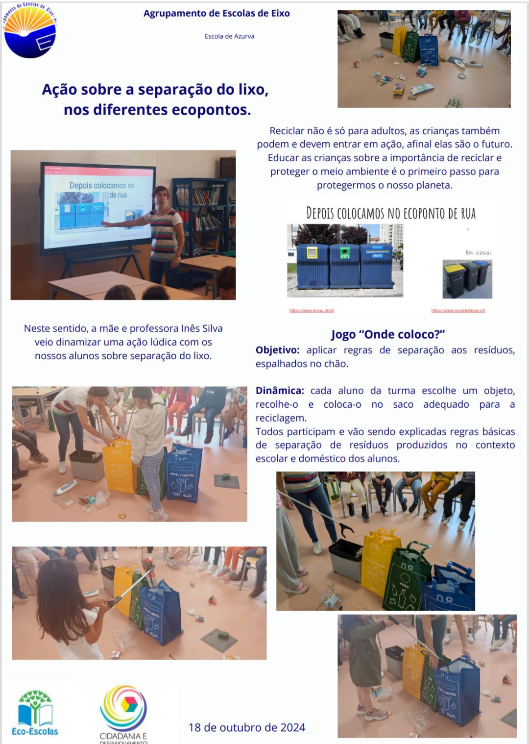 Neste sentido, e no âmbito do Projeto Eco-Escolas, a encarregada de educação e professora Inês Silva dinamizou uma ação lúdica sobre a reciclagem e separação dos lixos! A diversão foi garantida e, mais uma vez, se comprovou que a brincar também se aprende!