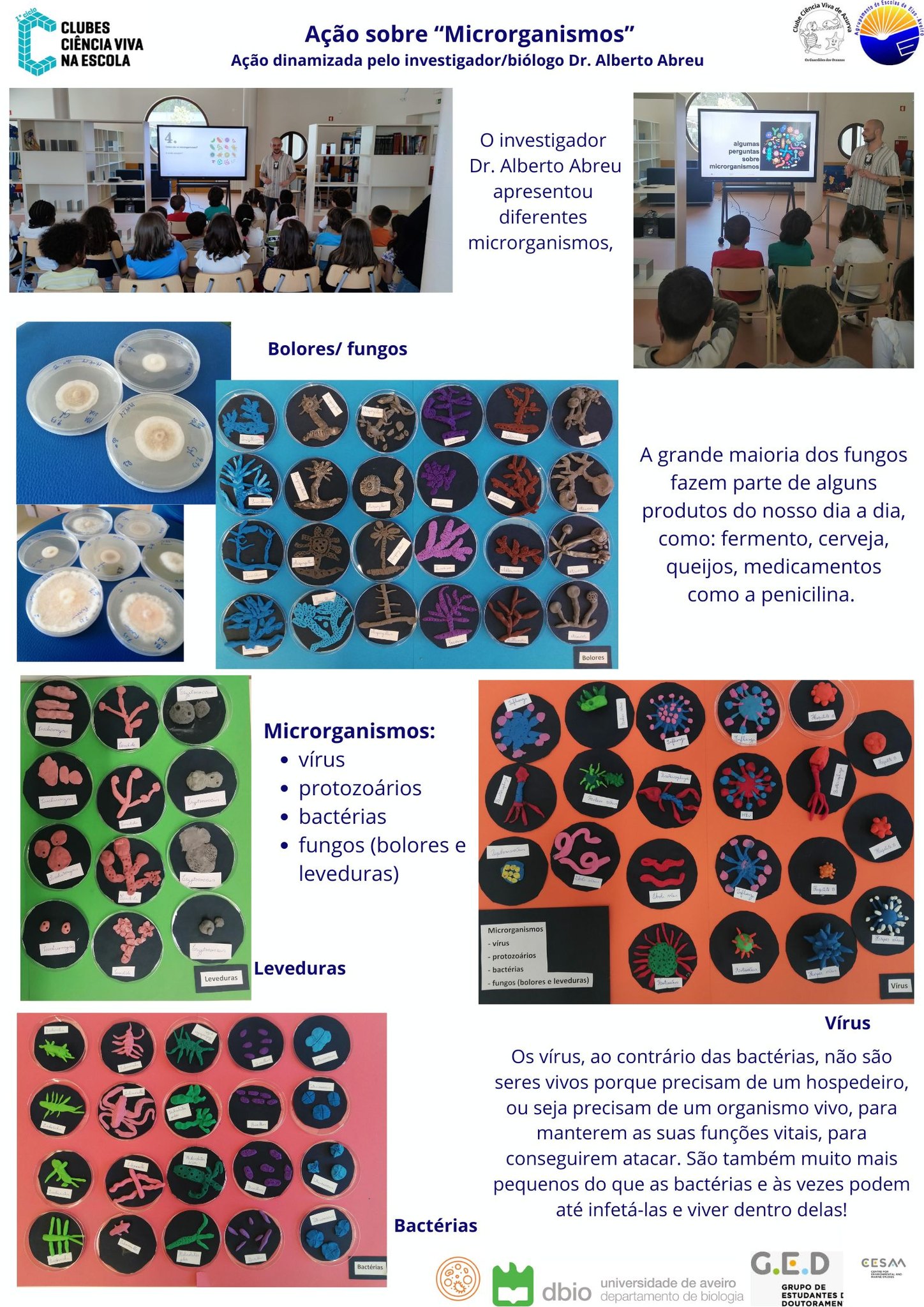 Apresentou aos alunos bactérias, vírus e fungos (bolores e leveduras) que puderam observar em caixas de Petri, presenciando o seu desenvolvimento.