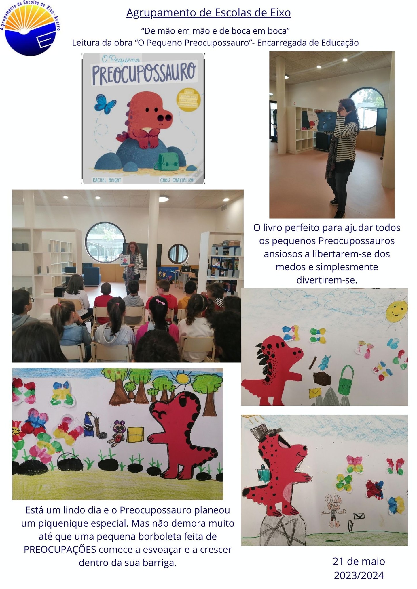A Encarregada de Educação Cristina Leal contou a história "O Pequeno Preocupossauro" e envolveu todos os pequenos “Preocupossauros” ansiosos a libertarem-se dos medos e a perceber que o ter medos é saudável e ajuda a crescer! O segredo é aprender a lidar com eles!