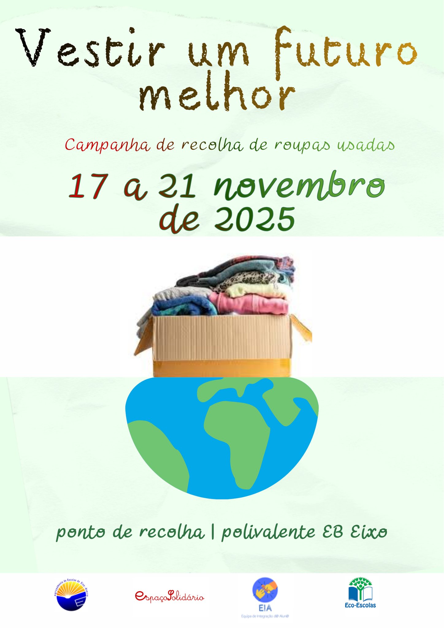 De 17 a 21 de novembro, o AEEixo vai promover uma campanha de recolha de roupa usada, no âmbito do Projeto "Espaço Solidário", com um propósito duplo e poderoso: solidariedade e sustentabilidade.