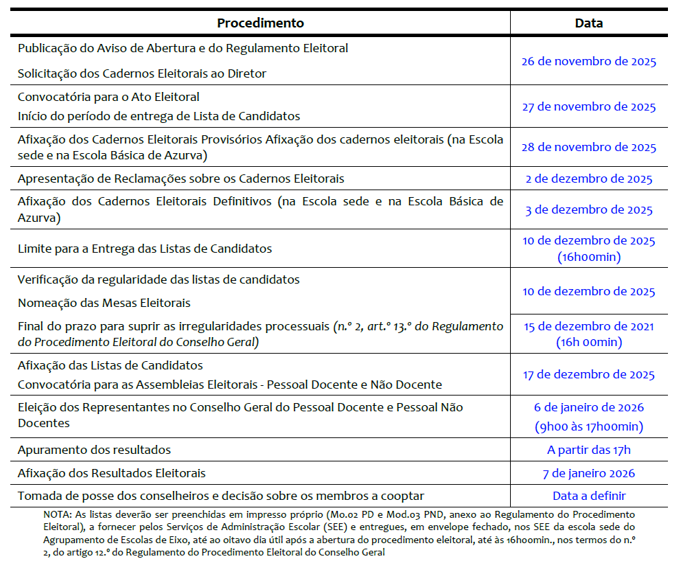 Nos termos do disposto no artigo 8.º do Regulamento do Procedimento Eleitoral do Conselho Geral, torna-se público que se encontra aberto o Procedimento eleitoral para a eleição dos representantes do Pessoal Docente e Pessoal Não Docente, de acordo com o seguinte cronograma aprovado em reunião de Conselho Geral: