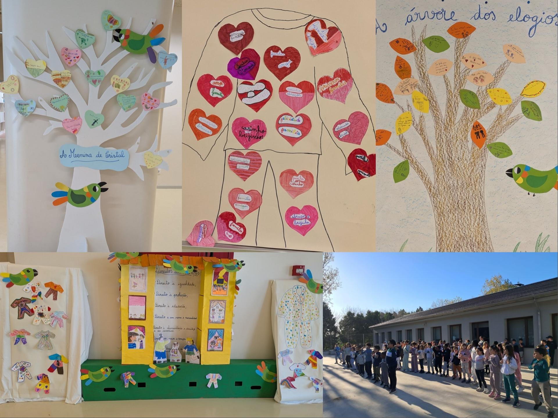 No nosso Agrupamento, os alunos do 1.º CEB envolveram-se com enorme entusiasmo nesta celebração. Durante o dia, exploraram a história "A Menina de Cristal", criaram diversos cartazes – incluindo a encantadora “Árvore dos Elogios” – construíram e ilustraram pijamas, visualizaram vídeos do site oficial da UNICEF, e dançaram ao som da música “Não Te Serve Este Abraço”, criada pela cantora Ágata para a Missão Pijama 2025.