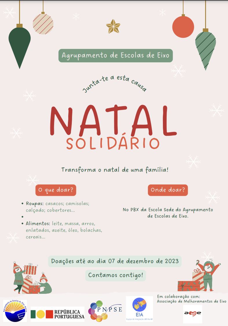 A Equipa de Integração Do/a Aluno/a (EIA), do AEEixo iniciou esta semana a campanha "Natal Solidário", que pretende apoiar famílias. O objetivo é recolher alimentos e roupas quentinhas!