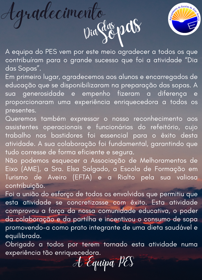 O dia das sopas foi um franco momento de partilha e de promoção de práticas de alimentação saudável que propiciou um salutar convívio e envolveu toda a comunidade educativa. As V. panelas foram muito bem-vindas e apreciadas!