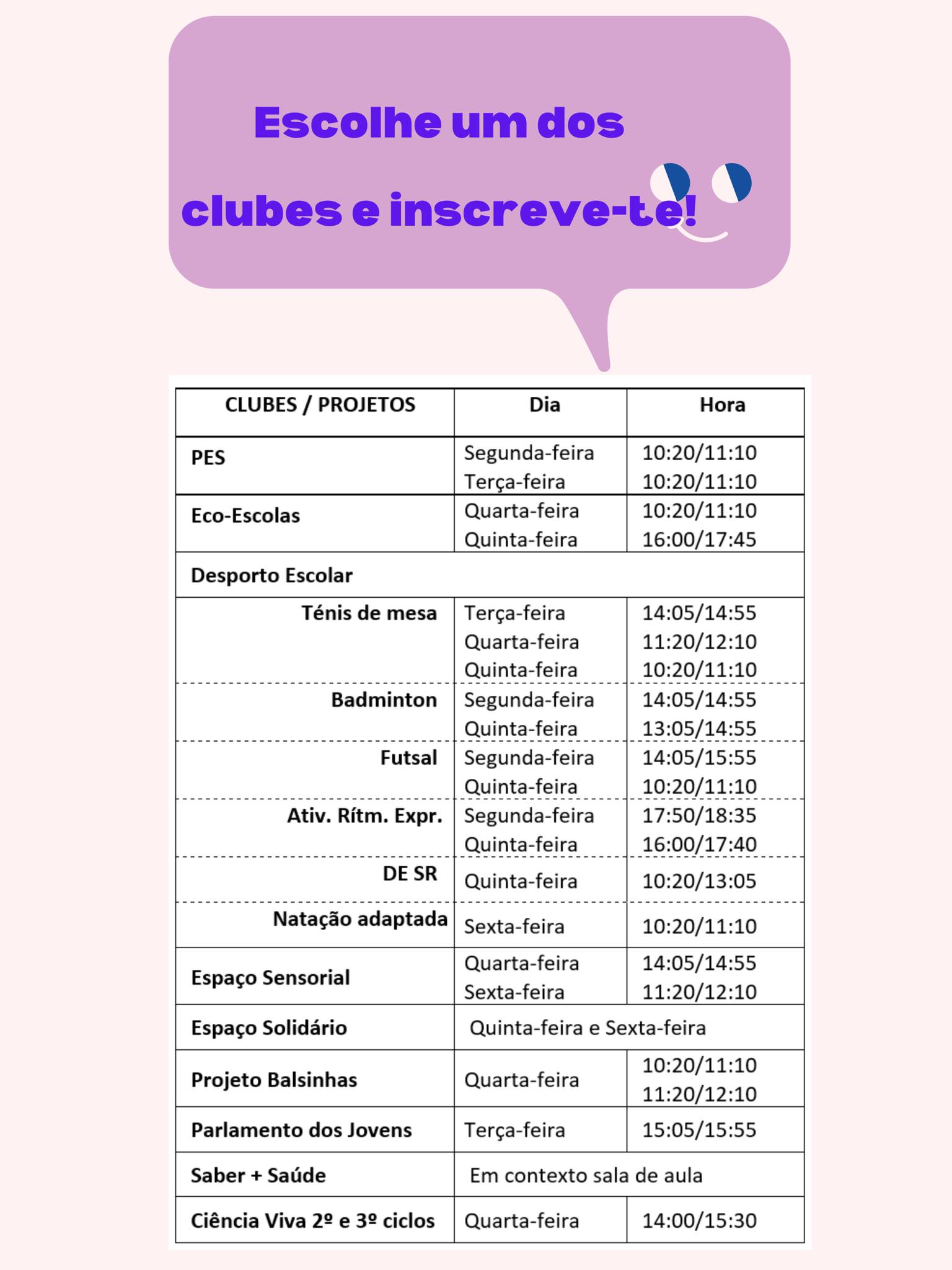 Os Clubes e Projetos desenvolvidos em contexto escolar constituem atividades de complemento de enriquecimento curricular importantes para o desenvolvimento integral dos alunos. Neste âmbito, o AEEixo coloca à disposição da comunidade discente diversas atividades (divulgadas no cartaz), nas quais todos se poderão inscrever.