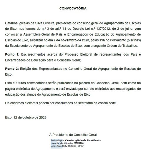 Ricardo Miguel Susana Gaspar, diretor do Agrupamento de Escolas de Eixo, informa que se encontra aberto, nos termos do n.º 4 do art.º 39.º do Decreto-Lei n.º 132/2012, de