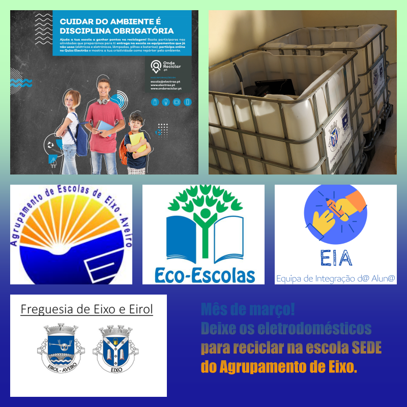 O Agrupamento de Escolas de Eixo em parceria com a Junta de Freguesia de Eixo e Eirol, volta à ação com a continuidade do Projeto Escola Eletrão, promovido pela Associação de Gestão de Resíduos Sólidos, cujo objetivo é sensibilizar a Comunidade Educativa e a Comunidade em Geral no seu envolvimento no processo de reciclagem de equipamentos elétricos. Assim, no decorrer do mês de março podem entregar todos os aparelhos elétricos na Escola Sede do Agrupamento (aparelhos de maiores dimensões e outros) ou nas Escolas do 1CEB de Azurva e de Requeixo. O Eletrão tem como missão: Assegurar a correta deposição dos resíduos de equipamentos elétricos e dos resíduos de pilhas e baterias usadas.