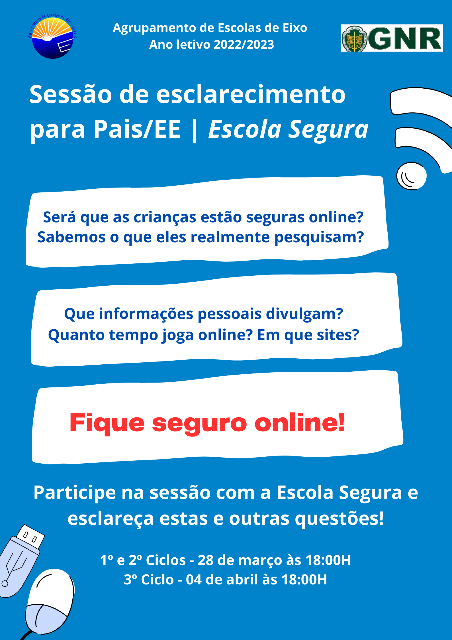 No âmbito do Plano de Ação de Desenvolvimento Digital de Escola (PADDE) do Agrupamento de Escolas de Eixo, em colaboração com programa Escola Segura da Guarda Nacional Republicana, Comando Territorial de Aveiro, Destacamento Territorial de Aveiro, convidam-se os Encarregados de Educação dos alunos do 1º ciclo do Ensino Básico para uma sessão de esclarecimentos no dia 14 de março de 2023, pelas 18:00h na escola sede do agrupamento (Escola Básica de Eixo - Rua do Forno, Apartado 27 3801-501 Eixo).Pretende-se, com esta iniciativa, alertar os Encarregados de Educação para as diversas problemáticas de utilização da internet e dar informações sobre as plataformas utilizadas pelo agrupamento para o desenvolvimento das competências digitais dos alunos.