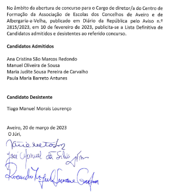 Divulga-se a Lista Definitiva de Candidatos/as Admitidos/as e Desistentes do Concurso para o Cargo de Diretor/a do Centro de Formação da Associação de Escolas dos Concelhos de Aveiro e de Albergaria-a-Velha, aberto pelo Aviso n.º 2815/2023, de 10 de fevereiro e publicado em Diário da República, da II Série de 10 de fevereiro.
