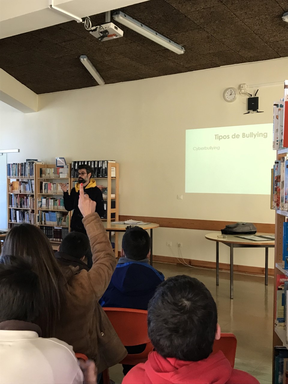 Estão a decorrer na biblioteca sessões destinadas a todas as turmas dos 2º e 3º ciclos, sobre a temática Bullying, com o lema "Amigos contra o Bullying", que terão continuidade nas salas de aula. Apresentam-se e debatem-se questões relacionadas com esta problemática, presente em todos os meios sociais. Contam com o formador Pedro Costa Santos, Consultor Pedagógico e com a coordenação da Biblioteca Escolar e dos Diretores de Turma.