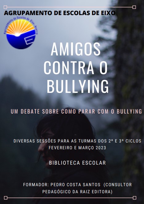 "No âmbito das relações sociais, a Biblioteca do nosso Agrupamento promove sessões de debate com o tema "Amigos contra o Bullying", nas aulas da área curricular de Espaço de Partilha, para as turmas dos segundo e terceiro ciclos. As sessões são dinamizadas pelo formador Pedro Costa Santos, consultor pedagógico da Raiz Editora e contam com a colaboração dos diretores de turma."