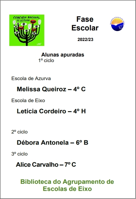 Parabéns a todos os participantes e às alunas que foram apuradas para a fase seguinte - o Concurso Municipal de Leitura que decorrerá nos dias 23 e 24 de fevereiro.