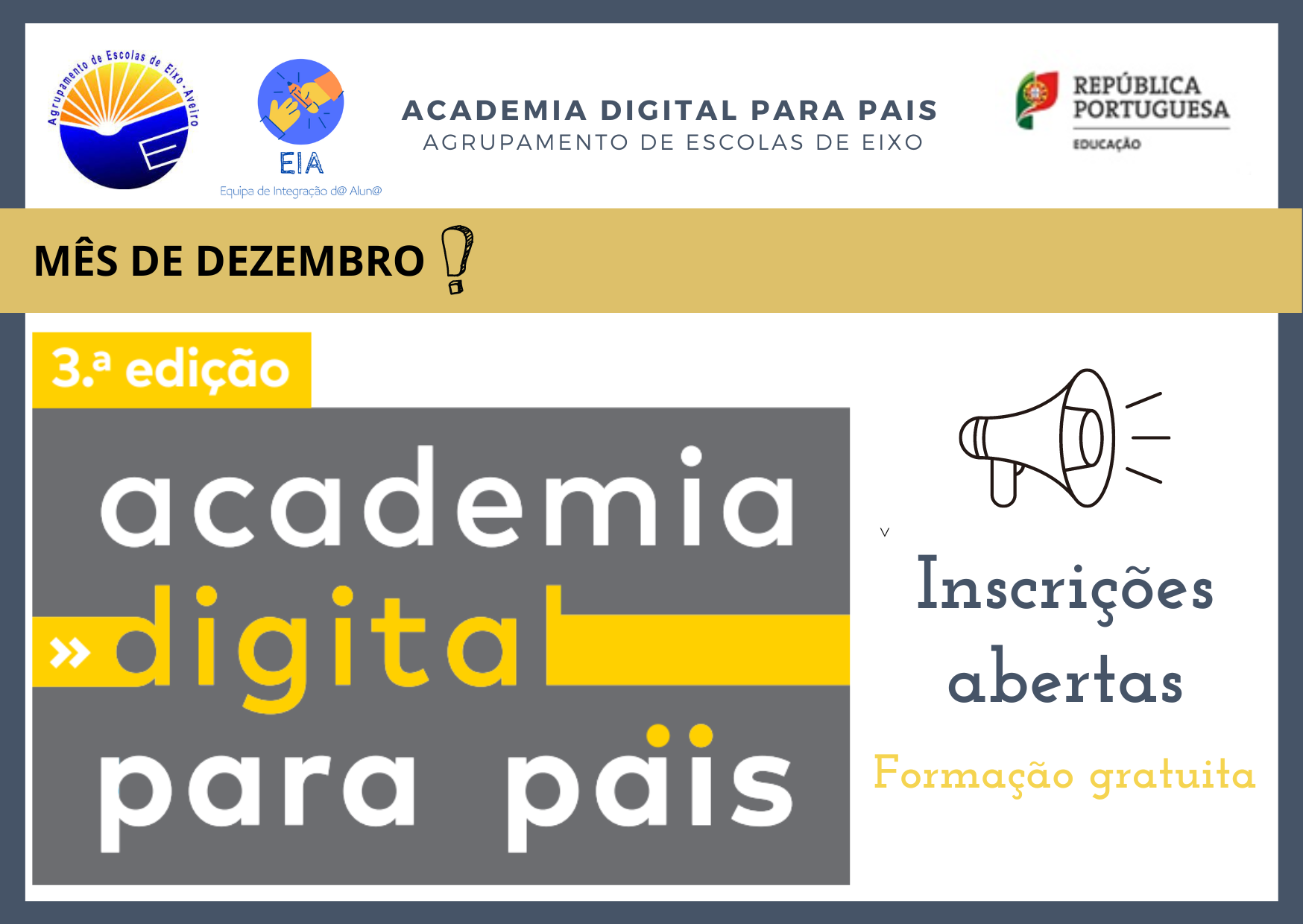À semelhança do ano transato, será desenvolvido o programa Academia Digital para Pais, que tem como objetivo capacitar Pais/EE dos/as alunos/as do ensino básico do nosso Agrupamento de Escolas, a nível das competências digitais básicas, de modo a poderem também ajudar melhor os seus filhos no seu percurso escolar.