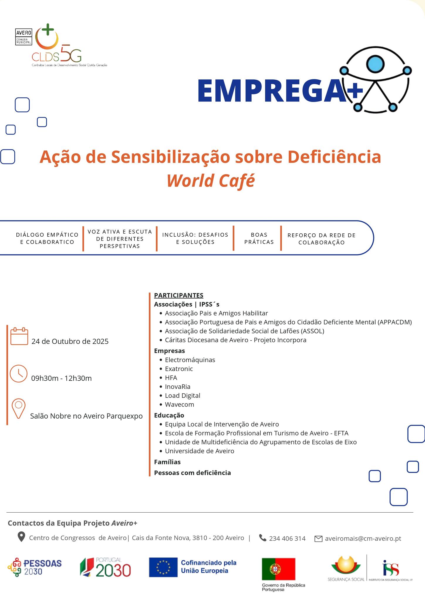 O AEEixo, representado pelo Departamento de Educação Especial, marcará presença em diversas ações do Projeto CLDS 5G Aveiro+, uma iniciativa da Câmara Municipal de Aveiro, aprovada no âmbito do programa Portugal 2030, que promove intervenções diversas para apoiar a inclusão social através de eixos de atuação, como o combate à discriminação, a capacitação comunitária e o desenvolvimento social.