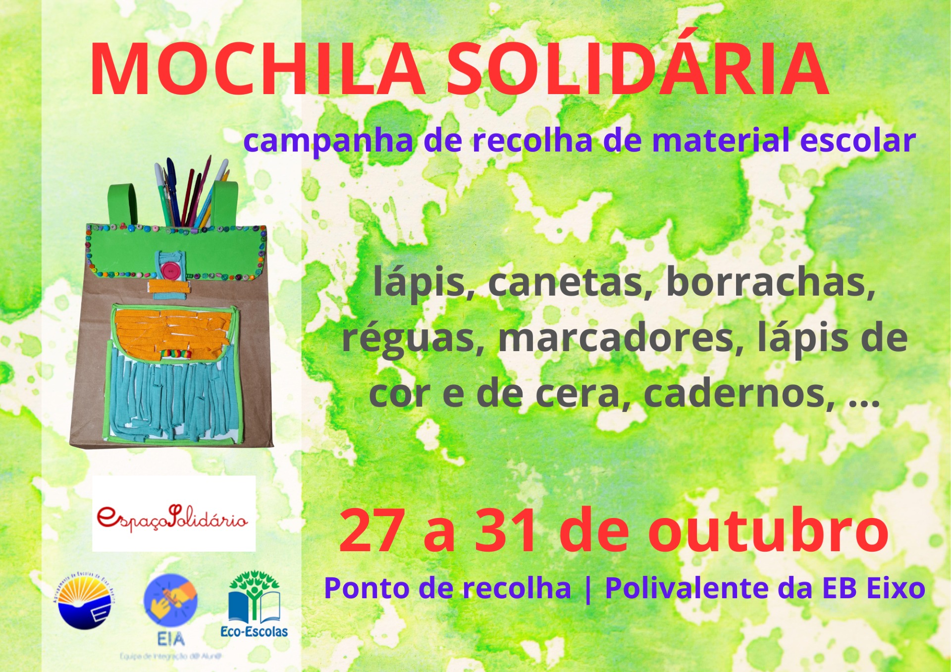 De 27 a 31 de outubro, junta-te à campanha “Mochila Solidária” e traz material escolar para apoiar quem mais precisa.