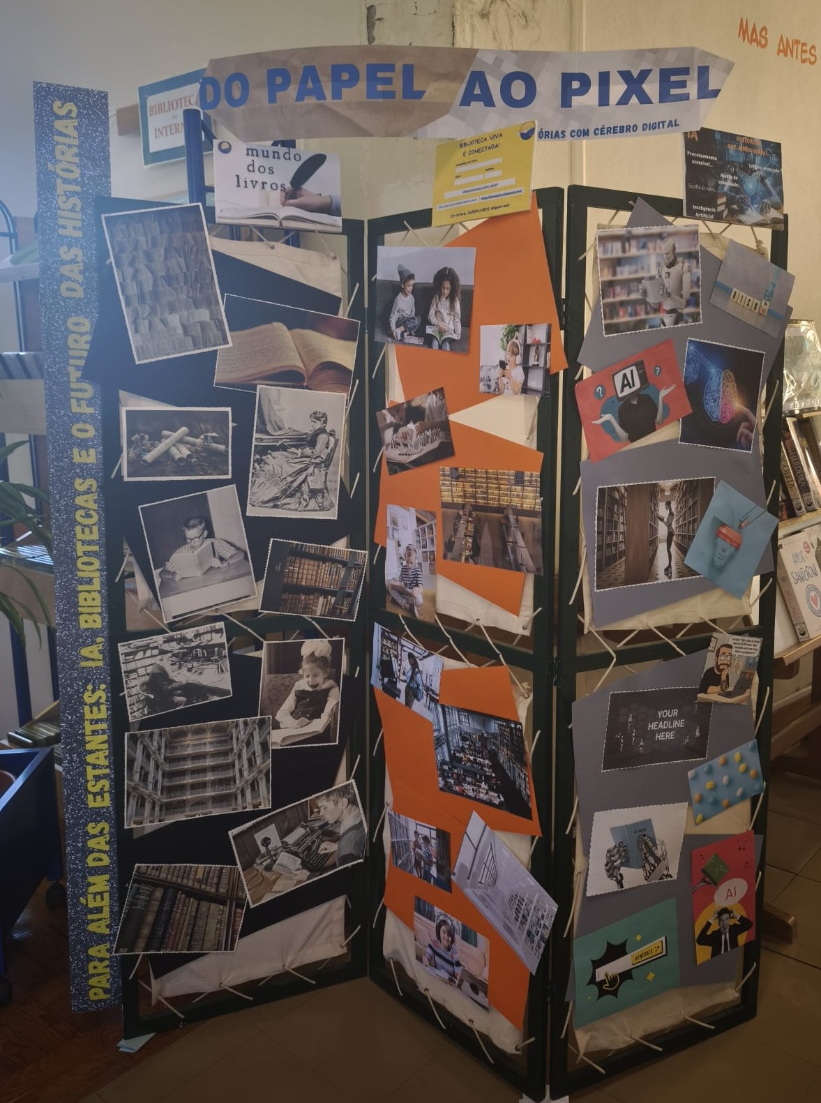 O projeto, dinamizado pela professora Ana Limas com a colaboração especial do aluno Pedro Cunha (6.º ano), deu vida a um biombo de 3 faces que representam o passado, o presente e o futuro das histórias.