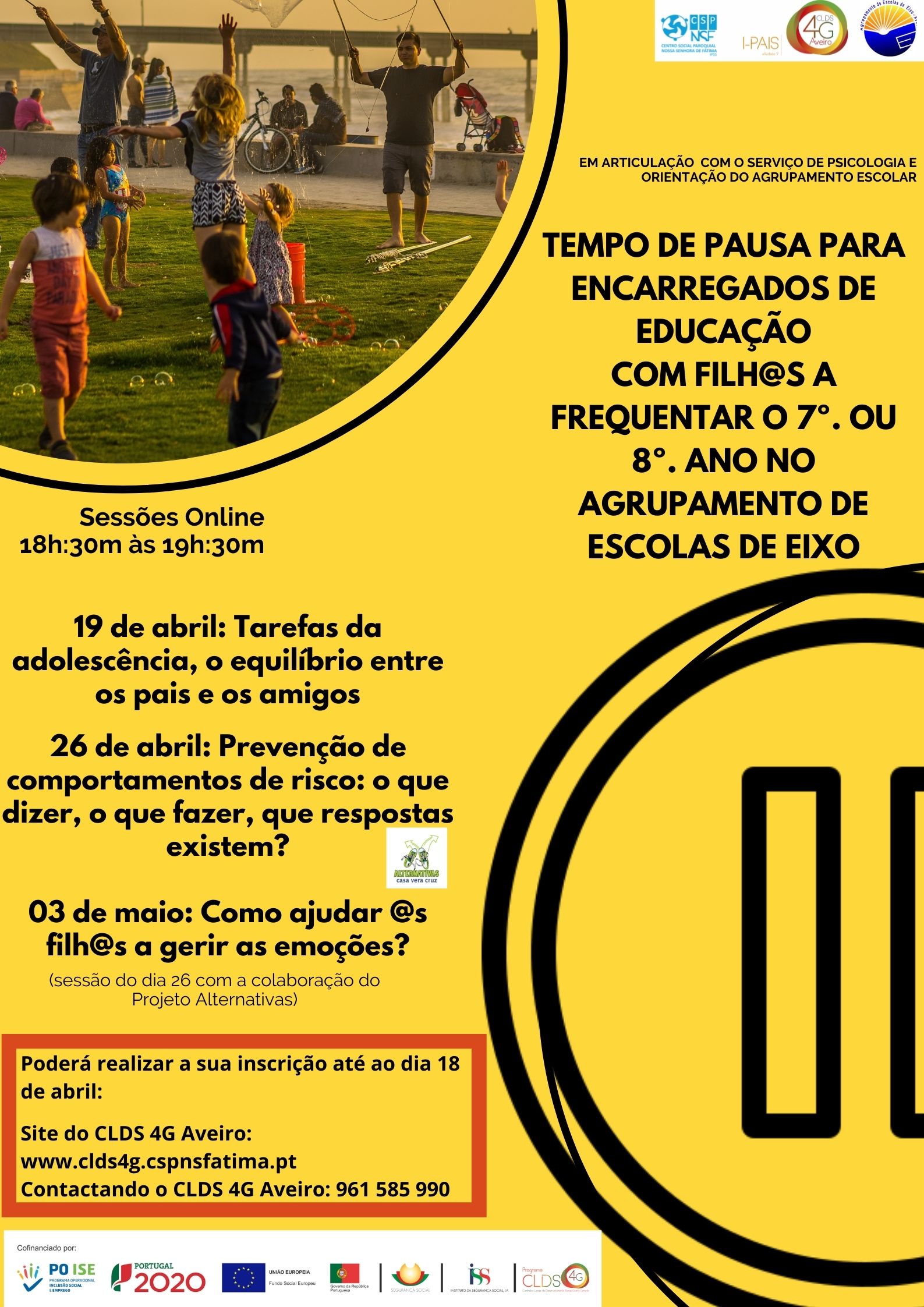Porque educar não é tarefa fácil, particularmente nos dias de hoje, e muitos pais são, não raras vezes, assolados por diversas dúvidas a respeito da melhor estratégia educativa, este Agrupamento de Escolas em estreita parceria com o Contratos Locais de Desenvolvimento Social - 4ª geração (CLDS 4G Aveiro) e articulação com os Serviços de Psicologia e Orientação (SPO) e o Serviço Social (SS), afetos a esta unidade de gestão, irão dinamizar a ação conjunta – "Tempo de Pausa para E.E. com filh@s a frequentar o 7º e o 8º anos do AEEixo", cujo programa se anexa.