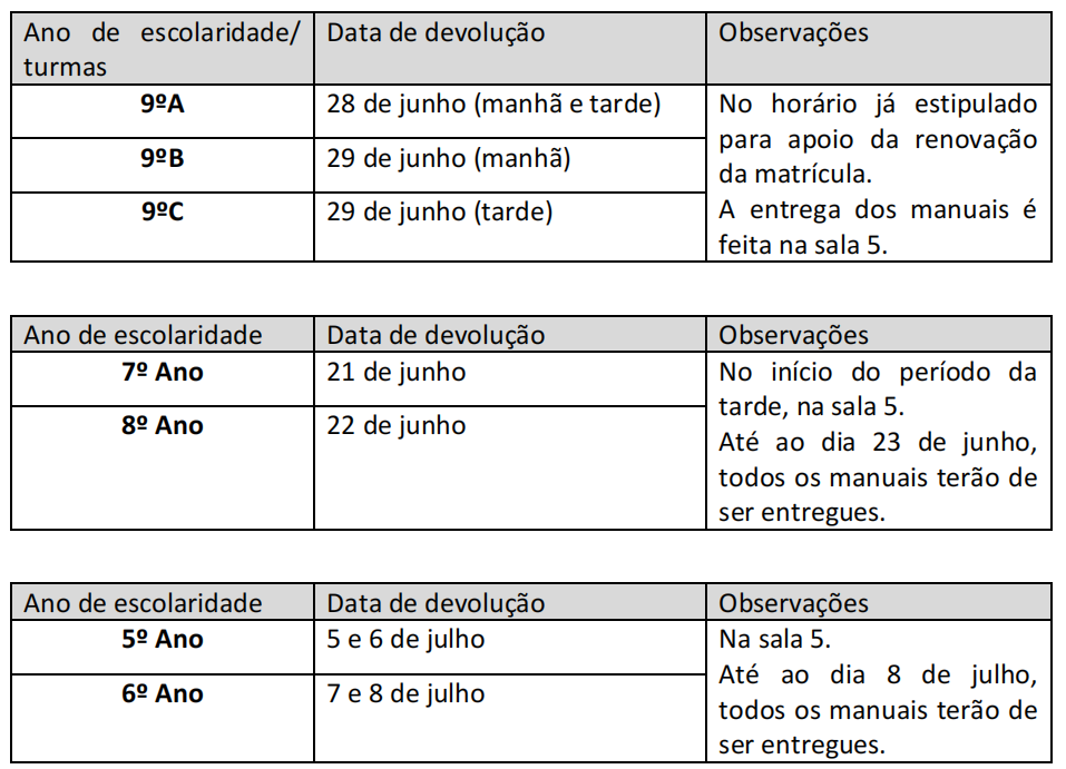 Solicitamos o cumprimento do seguinte procedimento: Os manuais terão de ser colocados num saco fechado, com a identificação do aluno (nome completo, nº, ano e turma), e entregue na sala 5 do edifício da escola sede, respeitando o cronograma seguidamente apresentado.