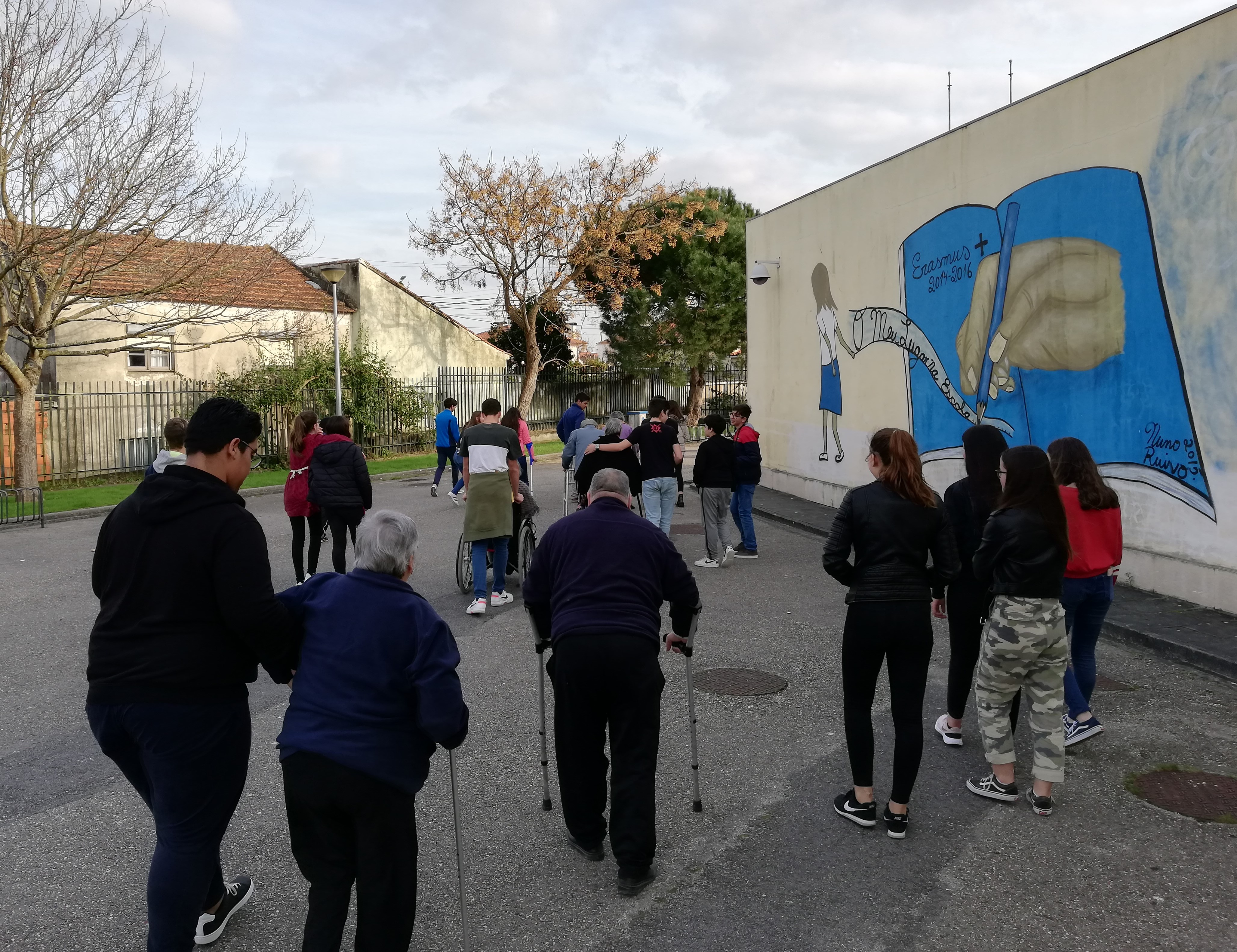 A visita começou com a deslocação dos alunos à AME para acompanhamento dos idosos, seguida de uma caminhada pelo recinto escolar e um pequeno momento cultural; terminou com um lanche/convívio oferecido pelos discentes, que acompanharam os seus convidados de volta à AME.