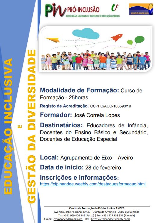 No nosso agrupamento decorrerá, em finais de fevereiro e em março, a formação "Educação Inclusiva e Gestão da Diversidade", promovida pelo Centro de Formação da Pró-Inclusão ANDEE. Este curso terá a duração de 25h, é acreditado, e destina-se a professores e educadores interessados (do agrupamento e de outras escolas/agrupamentos). Decorrerá em horário pós-laboral, no edifício da escola sede. É um curso pago.