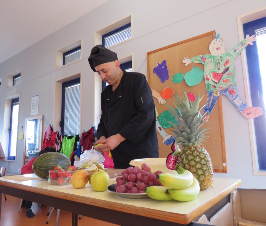 Equipado com a sua jaleca e gorro, manuseando as suas facas profissionais, deliciamos-nos a comer espetadas de fruta preparadas pelo Chefe!