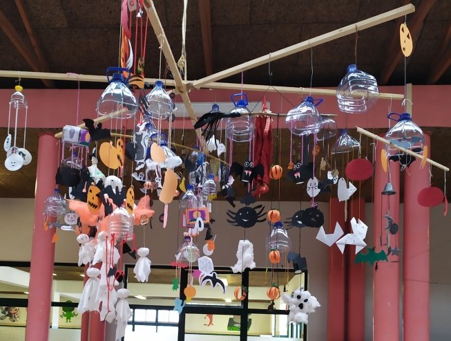 Os alunos do 5º ano, no âmbito da disciplina de E.T., fizeram móbiles individuais com reaproveitamento de materiais, com o objetivo de construir uma móbile gigante em que o tema foi o halloween.