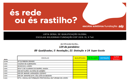 O agrupamento de escolas de Eixo foi reconhecido com a qualificação para a rede das Escolas Solidárias 9ª edição, iniciativa promovida pela fundação EDP e que visa a promoção da cidadania ativa e solidária. Este ano letivo foram mais de 510 escolas , de todos os distritos do país, que como a EB de Eixo responderam ao desafio Escolas Solidárias e AGIRAM! Agora estamos nas 98 escolas qualificadas.