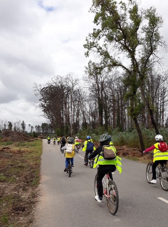 No dia 16 de maio, os alunos de 7º ano “deram ao pedal” pela região, num percurso de 20 Km: Eixo -“Ponte da Rata”- Eirol – Horta- Eixo. Numa atividade de articulação que envolveu várias disciplinas do currículo, os alunos, de guião e mapa na mão, pararam em várias “estações” pondo à prova conhecimentos, raciocínio, capacidade de observação e trabalho em equipa. De forma contextualizada, os professores intervinham acrescentando explicações ou lançando desafios. Não faltou tempo também destinado só à brincadeira! A atividade contou com a excelente colaboração: a) da Associação Cicloeixo, quer no arranjo das bicicletas, quer no acompanhamento sábio e experiente; b) dos agentes da Escola Segura que zelaram, ao detalhe, pela segurança de todos, do início ao fim do percurso; c) da Junta de Freguesia de Eixo/Eirol, que também nos acompanhou, partilhando saberes históricos e geológicos, e abrindo-nos as portas da sua “Casa do Povo” de Eirol para descanso e reabastecimento do grupo! A todos muito, muito obrigado!