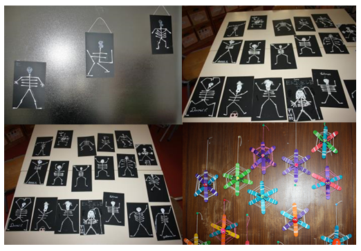 Os alunos do 2º ano elaboraram teias de aranha utilizando paus de gelado, pompons de várias cores e fio branco e cor de rosa. Os alunos do 3º e 4ºano construíram esqueletos usando os seguintes materiais: cotonetes, cartolina preta, branca e cola.
