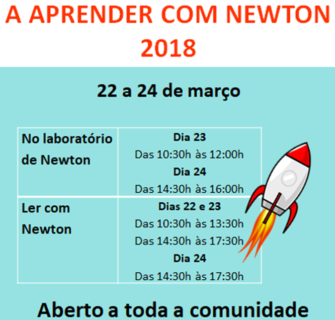 Nos dias 22 a 24 será dinamizada a atividade A Aprender com Newton. Pela mão dos alunos será feita uma divulgação de experiências simples, realizadas no âmbito do projeto “Aprender com o projeto Newton gostava de ler”.