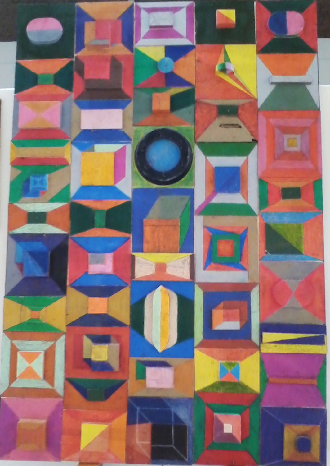 Trabalhos dos alunos do 8ºA e 8ºB (telas) e do 7º, 8ºe 9º anos (painel de madeira com pintura a pastel de óleo e cera)...