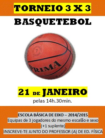 No próximo dia 21 de janeiro, quarta feira à tarde decorrerá o torneio de 3 contra 3 de Basquetebol, fase escola.