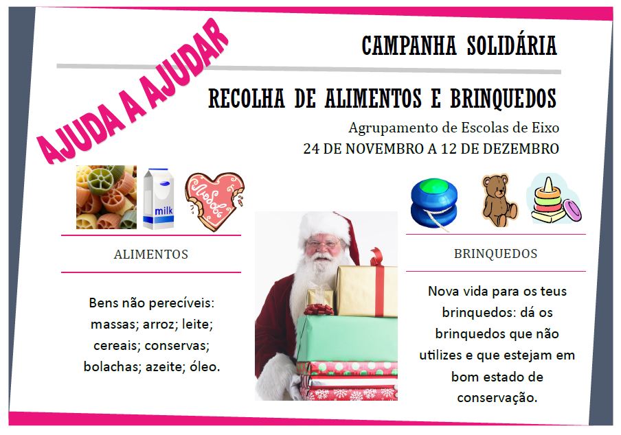 O Agrupamento de Escolas de Eixo inicia mais uma recolha de bens alimentares e de brinquedos, numa altura em que aumentam os pedidos de ajuda. Esta recolha vai realizar-se até ao final do dia 12 de dezembro...